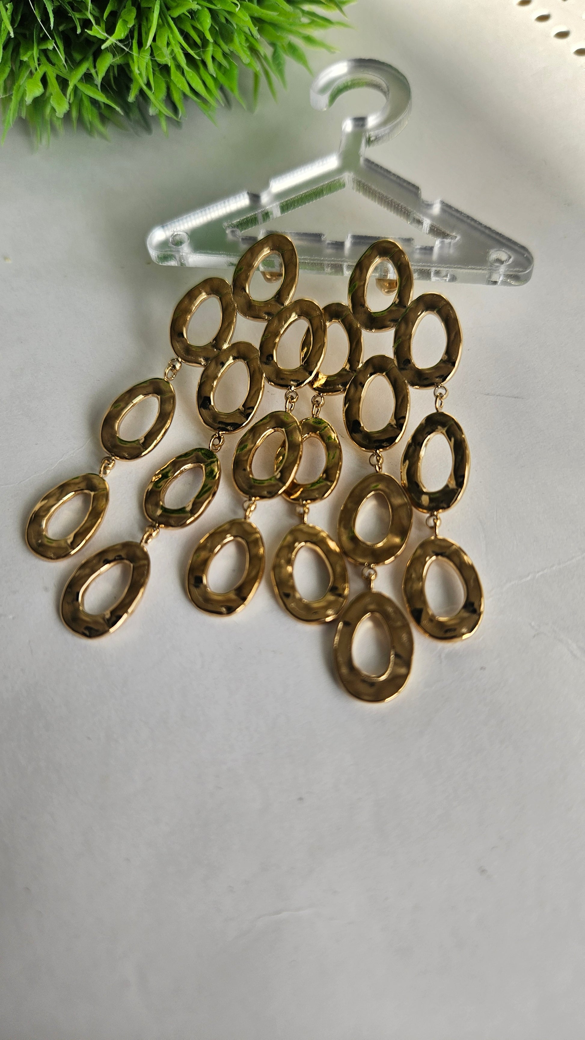 Long statement earrings available in gold and silver, crafted in stainless steel with cascading irregular oval links. Their hammered texture and fluid movement create a modern, elegant look that elevates any outfit—from day to night.