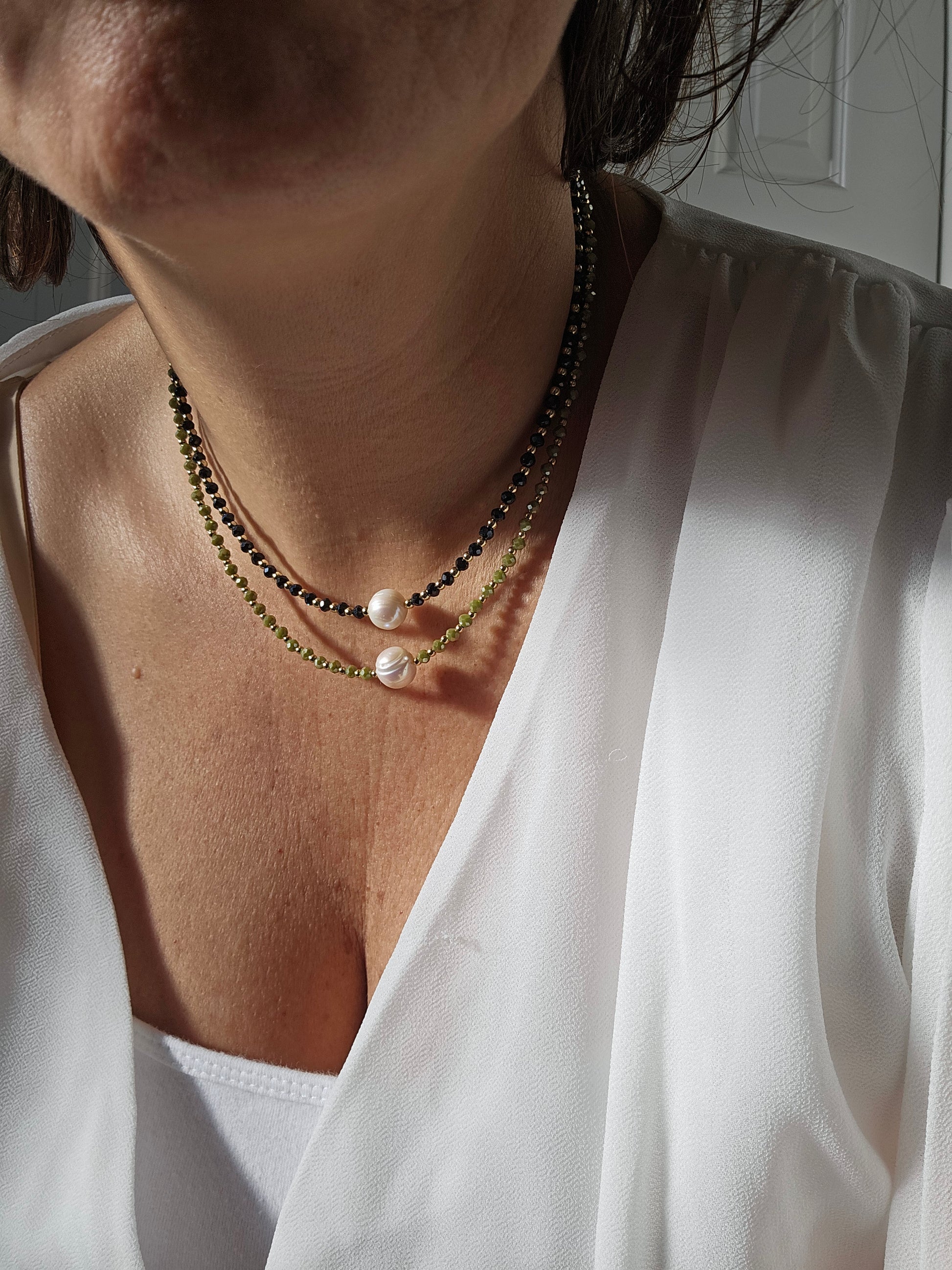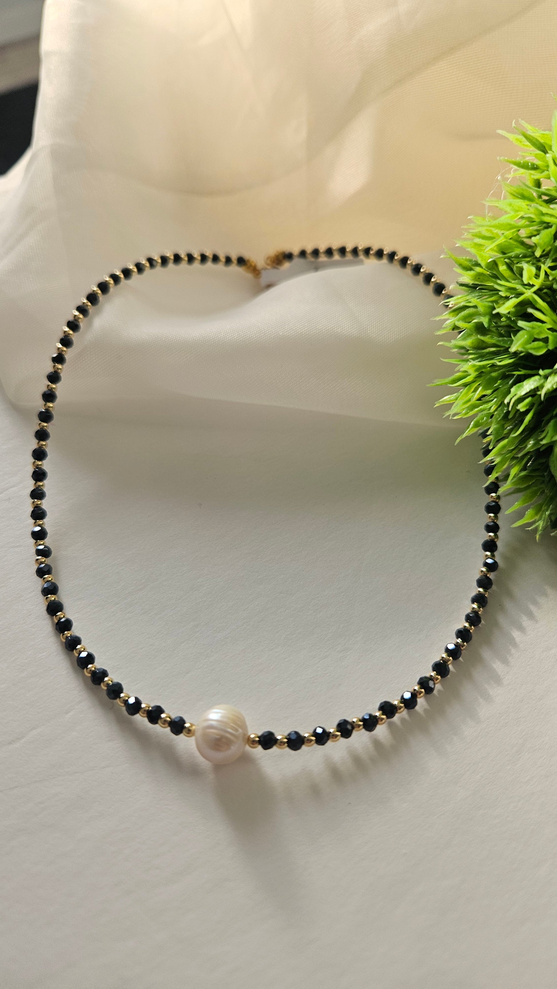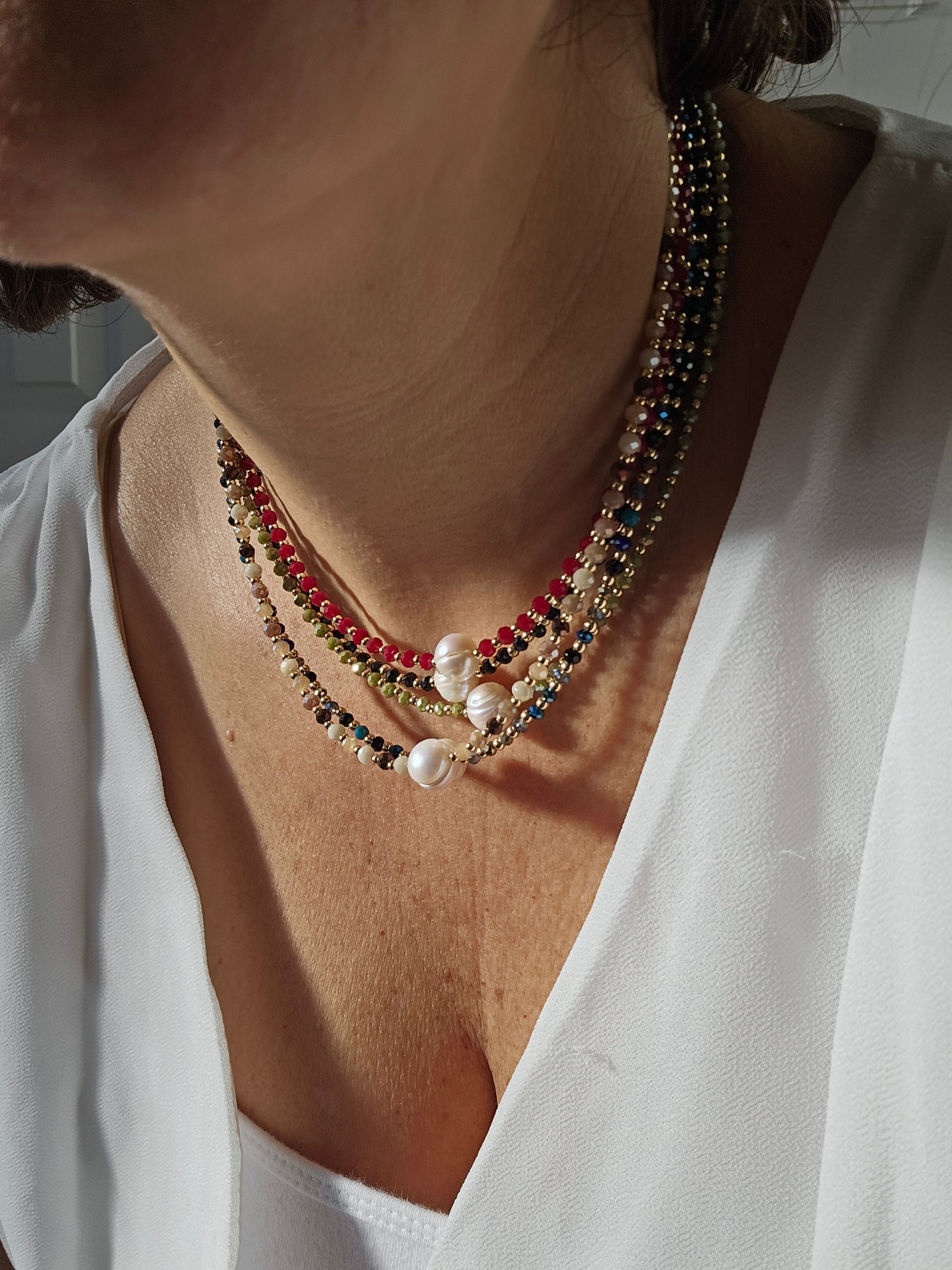 Short necklace of faceted beads with gold spacers and a natural pearl at the centre. Offered in three tones: