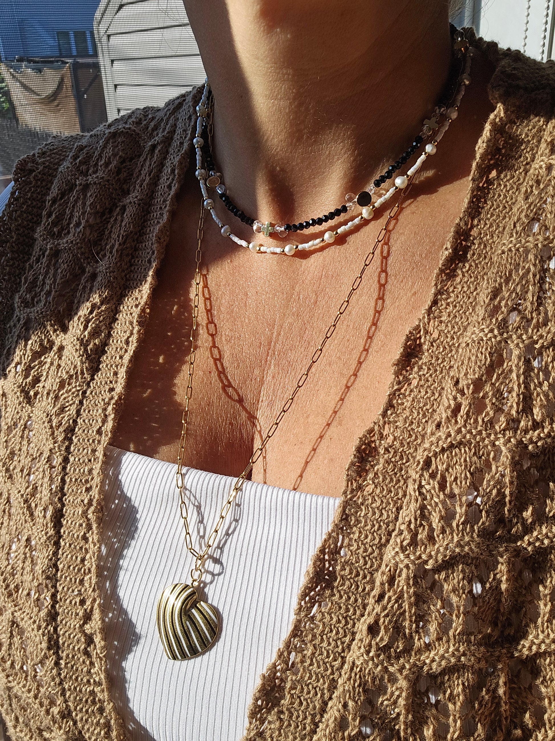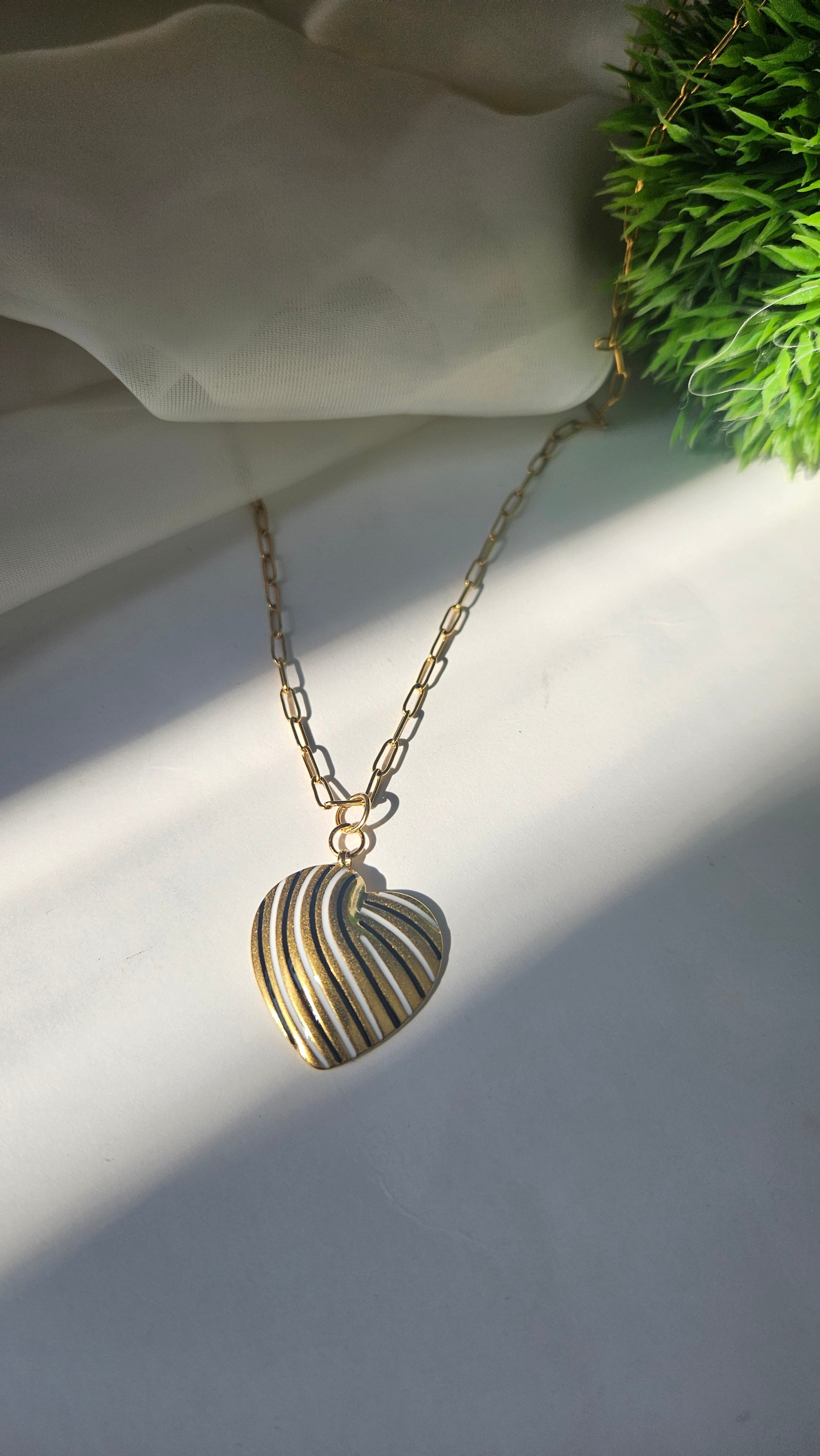 Gold necklace with elongated link chain and a heart-shaped pendant, adorned with delicate wavy lines in a two-tone gold and black finish. An elegant piece that blends classic charm with a modern touch, perfect to enhance any look.