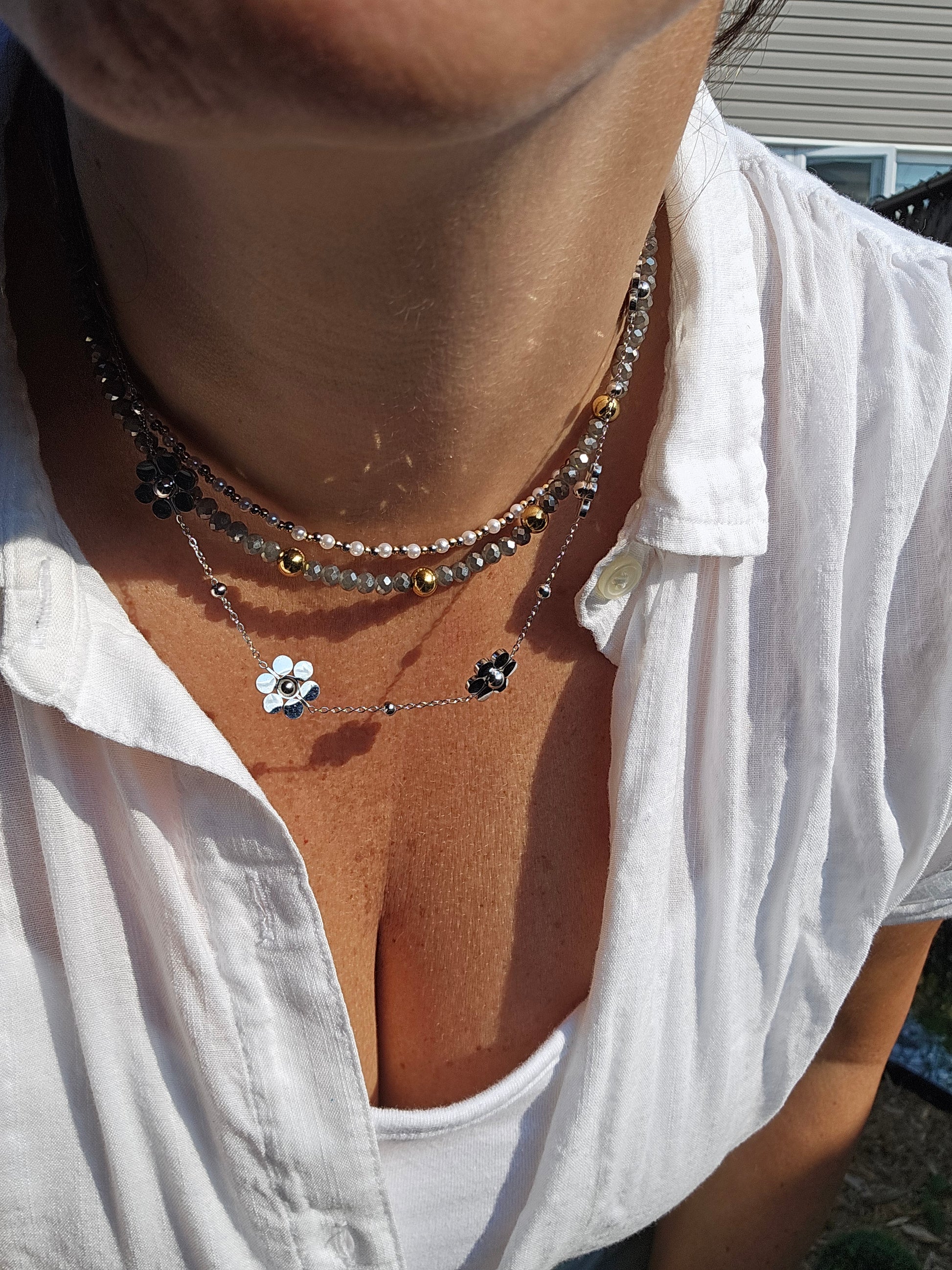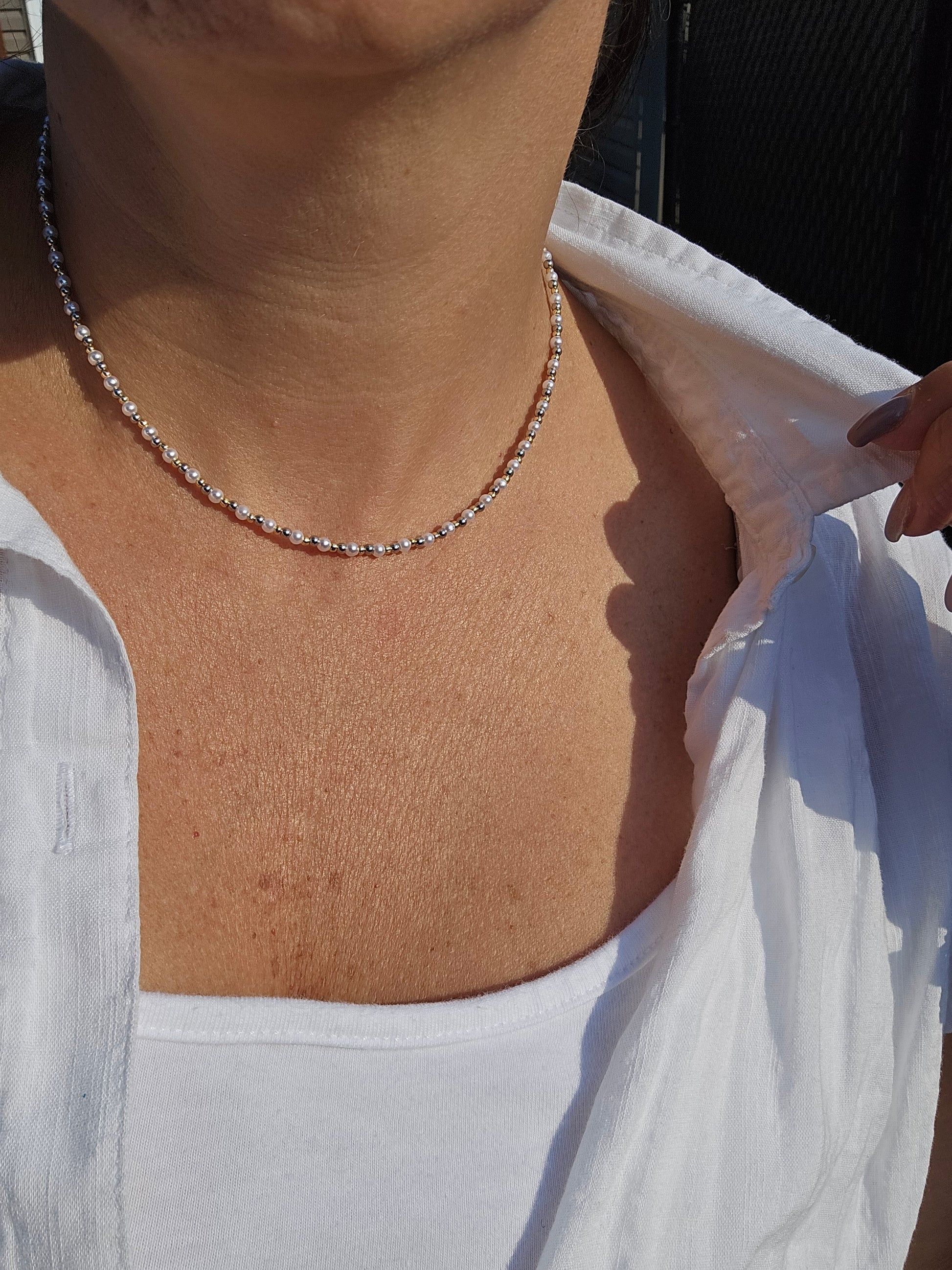 A minimalist yet striking piece that features delicate mini pearls paired with alternating gold and silver beads. Its timeless design adds effortless elegance to both casual and chic looks.