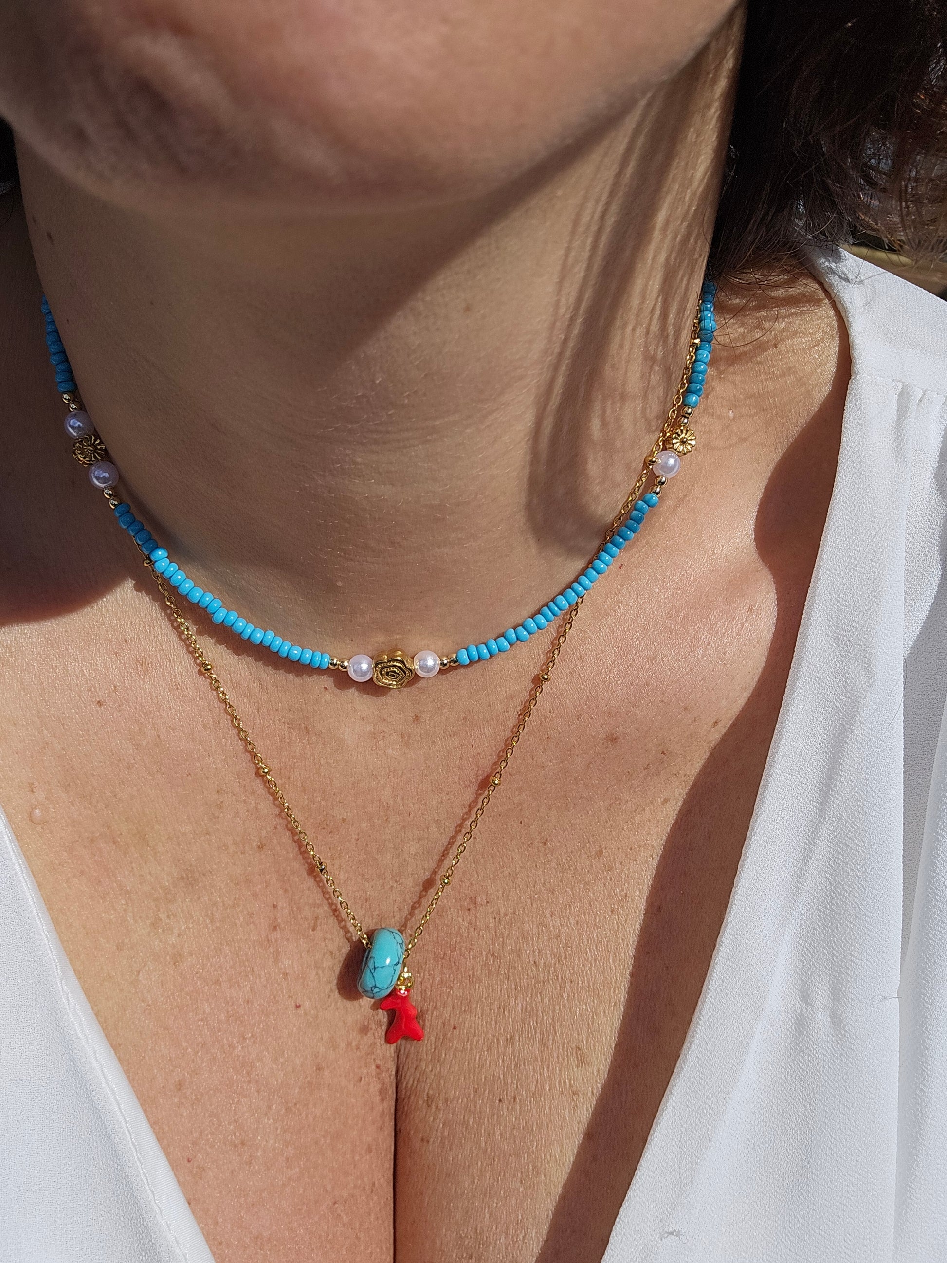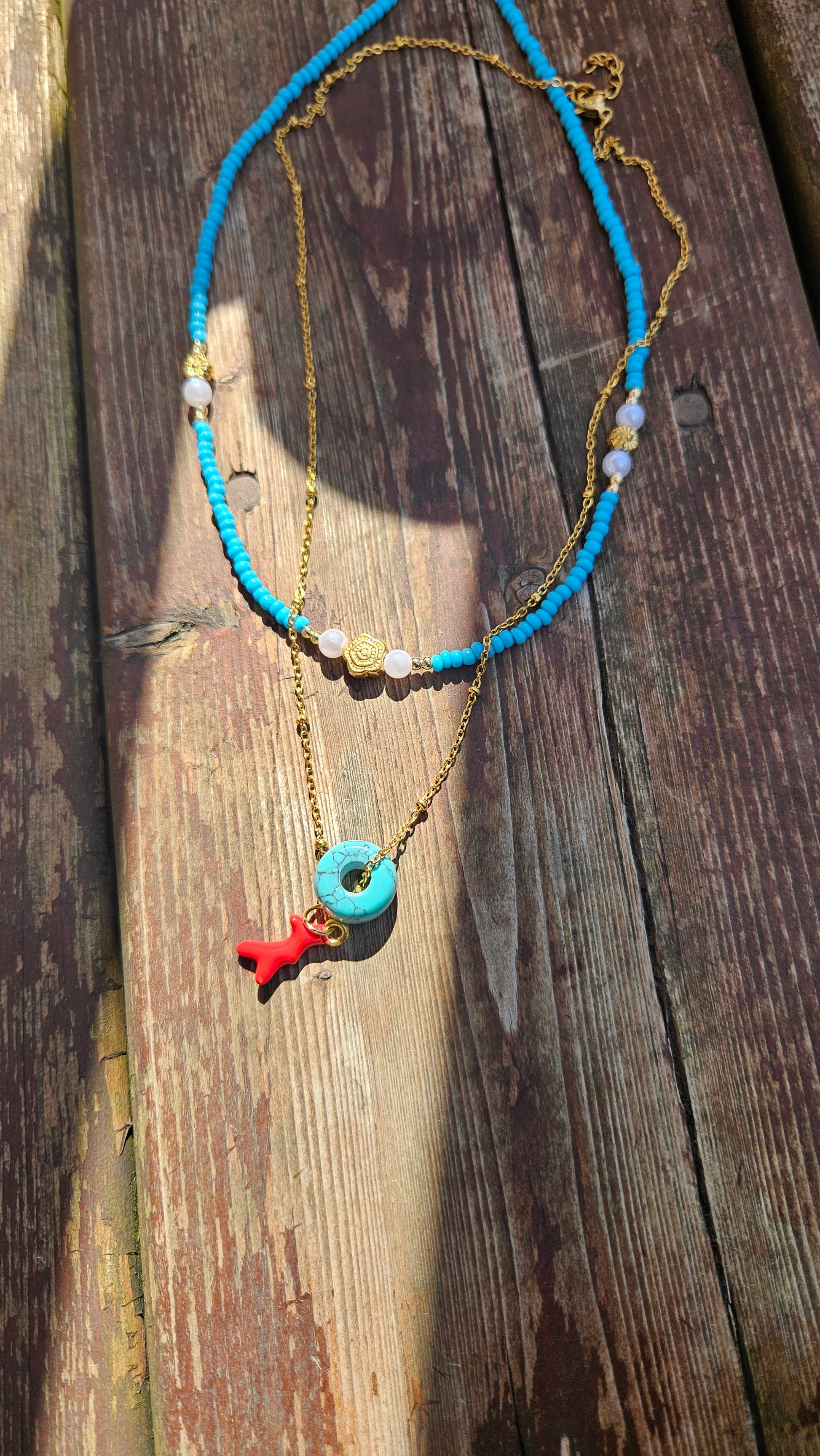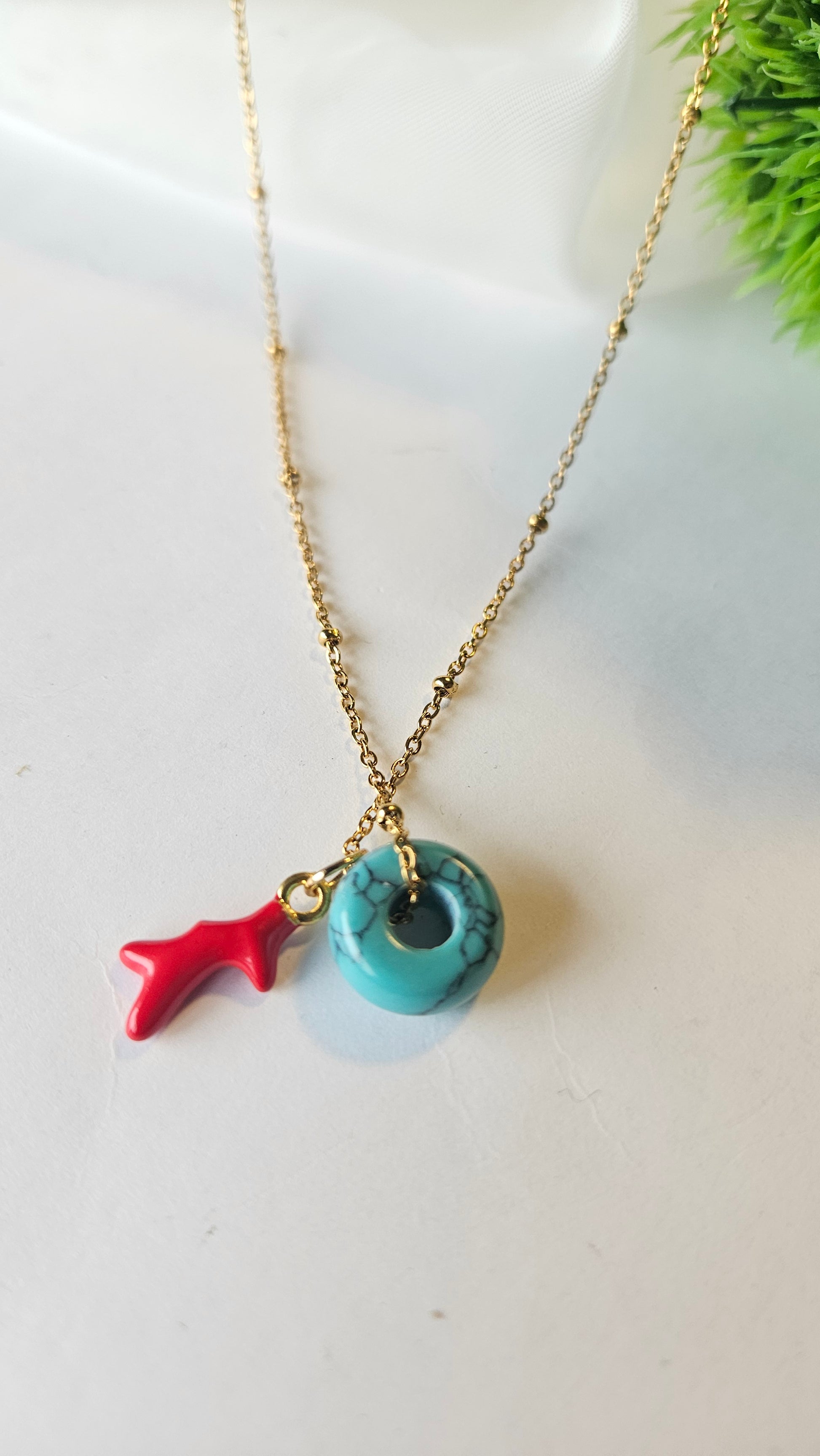 Turquoise beads - red ocen charms - gold necklace