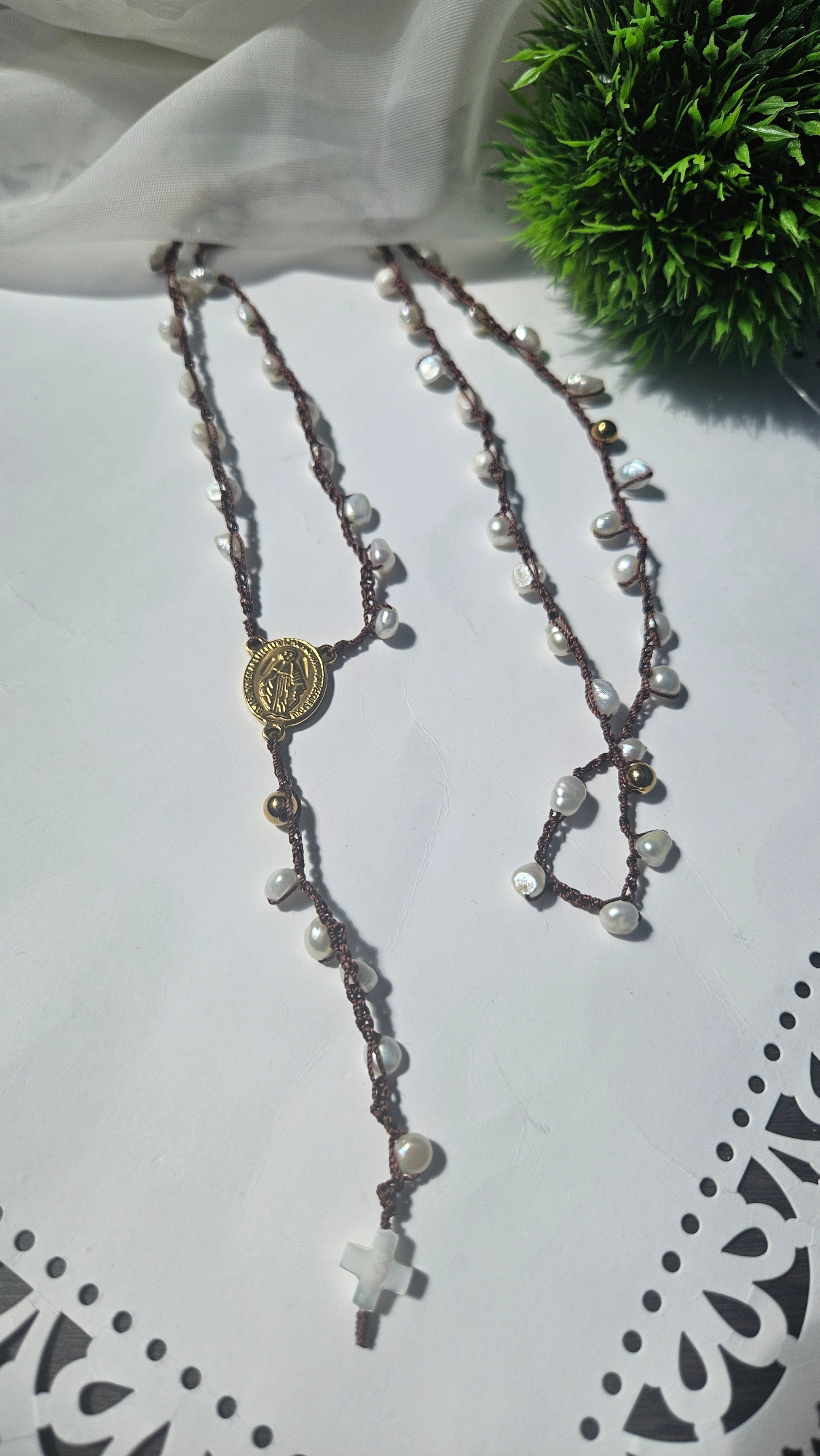 Handwoven with deep blue thread and natural pearls, symbolizing peace, purity, and divine protection.